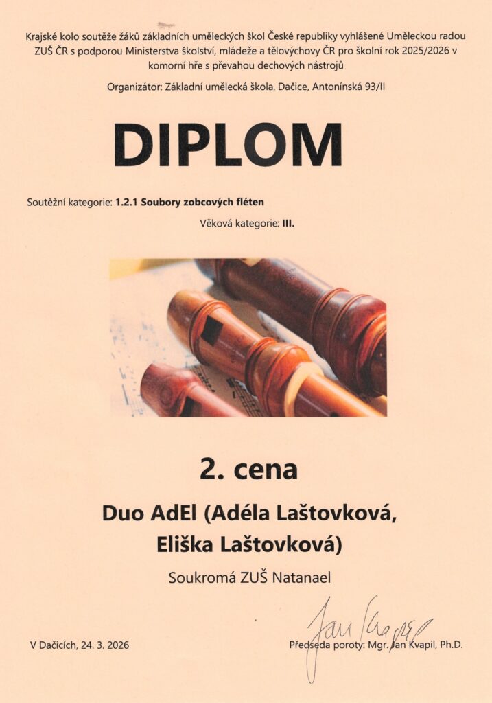 V Dačicích o den později duo zobcových fléten (Adéla a Eliška Laštovkovy) ze třídy Blanky Daškové získalo 2. cenu.